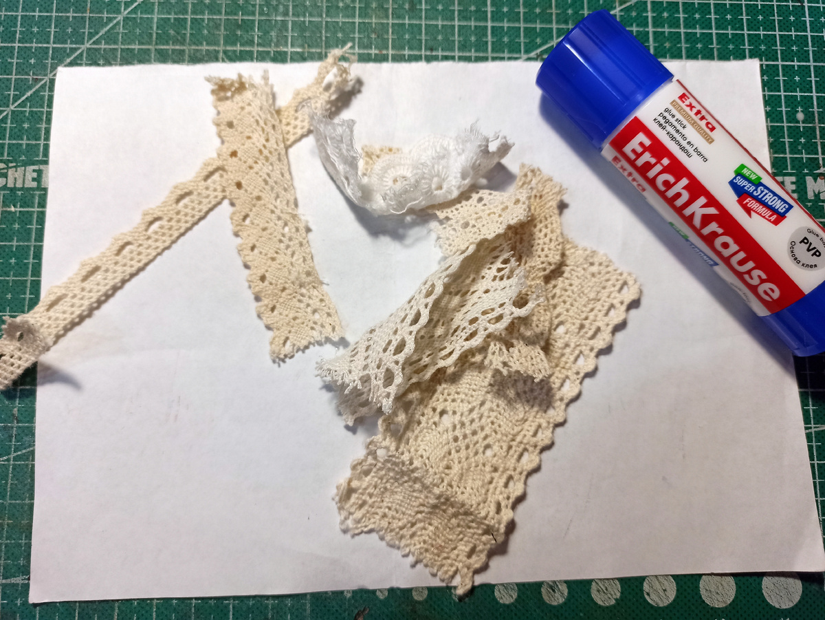 В своем творческом блокноте я храню выкройки и фото своих работ. Для хранения выкроек создаю кармашки или конвертики в разных техниках и из разных материалов. Сегодня для создания кармашков я буду применять остатки кружев. У меня собралось очень много маленьких кусочков кружева — это остатки от моих работ. Жалко выбросить даже самый маленький кусочек — вот и насобирала. За основу конверта использую черновик из половинки офисной бумаги А4, на которой одна сторона чистая. Приклеиваю кусочки кружева на клей-карандаш, можно на любой клей. Для работы подойдет разное кружево. Окрашивать кружево буду акриловыми спрей-красками. Красить буду кисточкой, и поэтому краски наливаю на палитру. Наношу краску на кружево мазками. После высыхания работы, следующим слоем буду накладывать белую краску, применяя технику сухой кисти. Белую краску слегка оббиваю на палитре и почти сухой кистью прохожу по поверхности окрашенного кружева. Подравниваю и разрезаю готовую деталь на два кармана. Один получился по