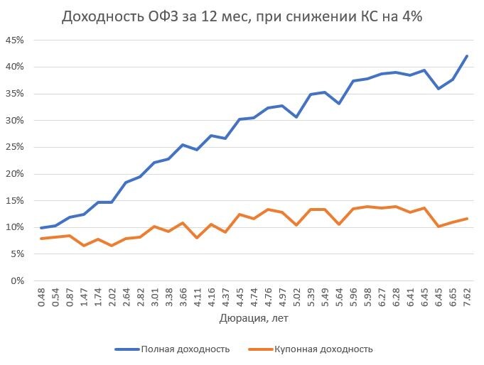 Покупать ли длинные ОФЗ? Пока идет плавное снижение КС, АА-ААА рублевые облигации размещаются под 15% и ниже. Например, новое размещение Новабева запланировано под 15% купон, Атомэнергопром последний раз разместился под 14.7%. Размещений корпоратов длиннее 3 лет почти нет, либо они с офертой. Длинные ОФЗ (>7 лет до погашения) имеют текущую доходность 13-14%, что ненамного ниже. Хотя у ОФЗ более низкий купон, но торгуются они дешевле номинала, например ОФЗ 26243 с купоном 9.8% торговалась 13 марта по 76%, что дает 9.8% / 76% = 12.9%. В то же время длинные ОФЗ имеют более длинную дюрацию, что дает больший потенциал переоценки. Например, самая дальняя ОФЗ 26238 с погашением в 2041 году имеет дюрацию 7.62, что теоретически должно приводить к росту ее тела на 7.62% на каждый 1% снижения ключевой ставки. На графике приведена совокупная доходность ОФЗ разных дюраций за 12 месяцев при условии, что ключевая ставка будет снижена на 4% в течение этого времени (то есть до 11.5% к марту 2027).
