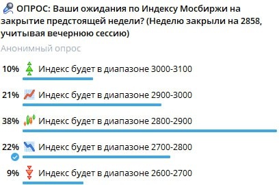 : 1️⃣ Опрос про ожидания по Индексу Мосбиржи! Неделю закрыли на уровне 2871, сделав за неделю +13 пунктов! 38% - ВАНГИ! Это большинство! 21% ожидали рынок в диапазоне 2900-3000. 22% ждали рынок в диапазон 2700-2800. В ожиданиях неопределенность без выраженного перевеса. 2️⃣Опрос по паре юань-рубль! Юань-рубль закрылся на уровне 11,6505, сделав за неделю +2,18%. Всего 16% голосовавших - Ванги! 31% ждали валюту ниже 11,50! 25% ждали валюту ниже 11,65. Апатичность в валютных парах была высокой! 🚗 МОЛОДЦЫ! Проведем несколько опросов с ожиданиями на следующую неделю! #опрос #bogdanoffinvest