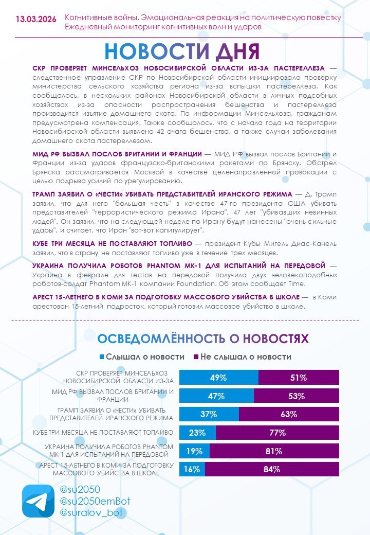 13.03.2026 🔹 Большинство опрошенных (63%) находятся в спокойном состоянии. Усталость отметили 18%, бодрость — 8%, а нервозность остается на минимальном уровне (4%). 🔹 Осведомленность о новостях этого дня чуть ниже среднего уровня. — Наиболее известными оказались две новости: что следственное управление СКР по Новосибирской области инициировало проверку министерства сельского хозяйства региона из-за вспышки пастереллеза, с которой связано изъятие домашнего скота из личных подсобных хозяйств (49% слышали), а также о том, что МИД РФ вызвал послов Британии и Франции из-за ударов французско-британскими ракетами по Брянску (47% слышали). — Наименее известным (только 16% были осведомлены) стало сообщение о том, что в Коми арестован 15-летний подросток, который готовил массовое убийство в школе. 🔹 Ярко выраженный негативный отклик вызвало заявление Д. Трампа о том, что для него "большая честь" в качестве 47-го президента США убивать представителей "террористического режима Ирана", 47 л