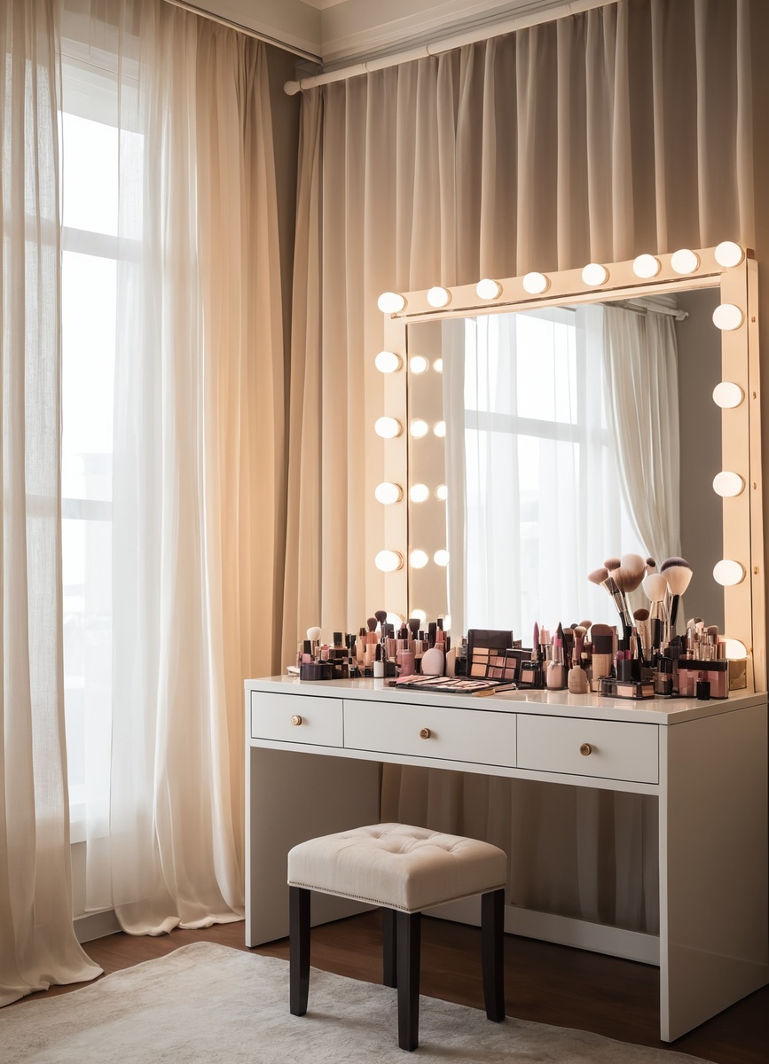 Шторы играют важную роль в контроле света. Выбор легких прозрачных тканей позволит пропускать естественный свет, а плотные шторы помогут затемнить пространство при необходимости. Цвет штор также влияет на восприятие отраженного света - теплые тона создают уютную атмосферу, а холодные могут сделать освещение менее комфортным для нанесения макияжа.