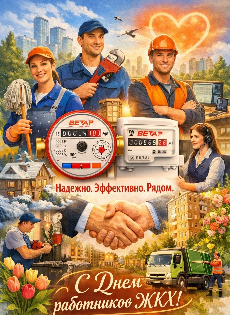 Сегодня профессиональный праздник людей, без которых невозможно представить нашу повседневную жизнь. Работники жилищно-коммунального хозяйства и бытового обслуживания - это те, кто ежедневно заботится о комфорте миллионов семей: чтобы в домах была вода и тепло, чтобы работали системы учета, чтобы города оставались чистыми и ухоженными. Команда БЕТАР от всей души поздравляет вас с профессиональным праздником! Ваш труд часто остается «за кадром», но именно благодаря вам дом становится местом уюта и спокойствия. Мы гордимся тем, что приборы учета БЕТАР помогают вам в этой важной работе и служат людям - сегодня они установлены практически в каждой второй семье. Надежно. Эффективно. Рядом. Пусть ваша работа всегда приносит заслуженное уважение, стабильность и уверенность в завтрашнем дне. Желаем крепкого здоровья, профессиональных успехов, благополучия и тепла - и на работе, и в каждом доме!