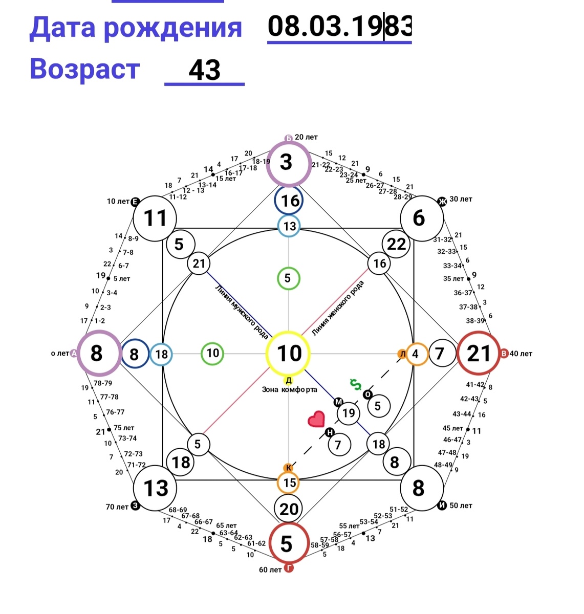 Что мы видим в центре? Правильно, 10 энергия Колесо Фортуны. Ксении и правда повезло родиться в не бедной семье, жить в Италии, учиться в хороших заведениях... Осталось только чего-то захотеть и начать движение в сторону цели, и тут Колесо начинает крутиться - находятся нужные люди, обстоятельства складываются наилучшим образом и т.д. А по жизни десятки - яркие, веселые, активные, компанейские. Здесь у Ксении энергия в плюсе.
