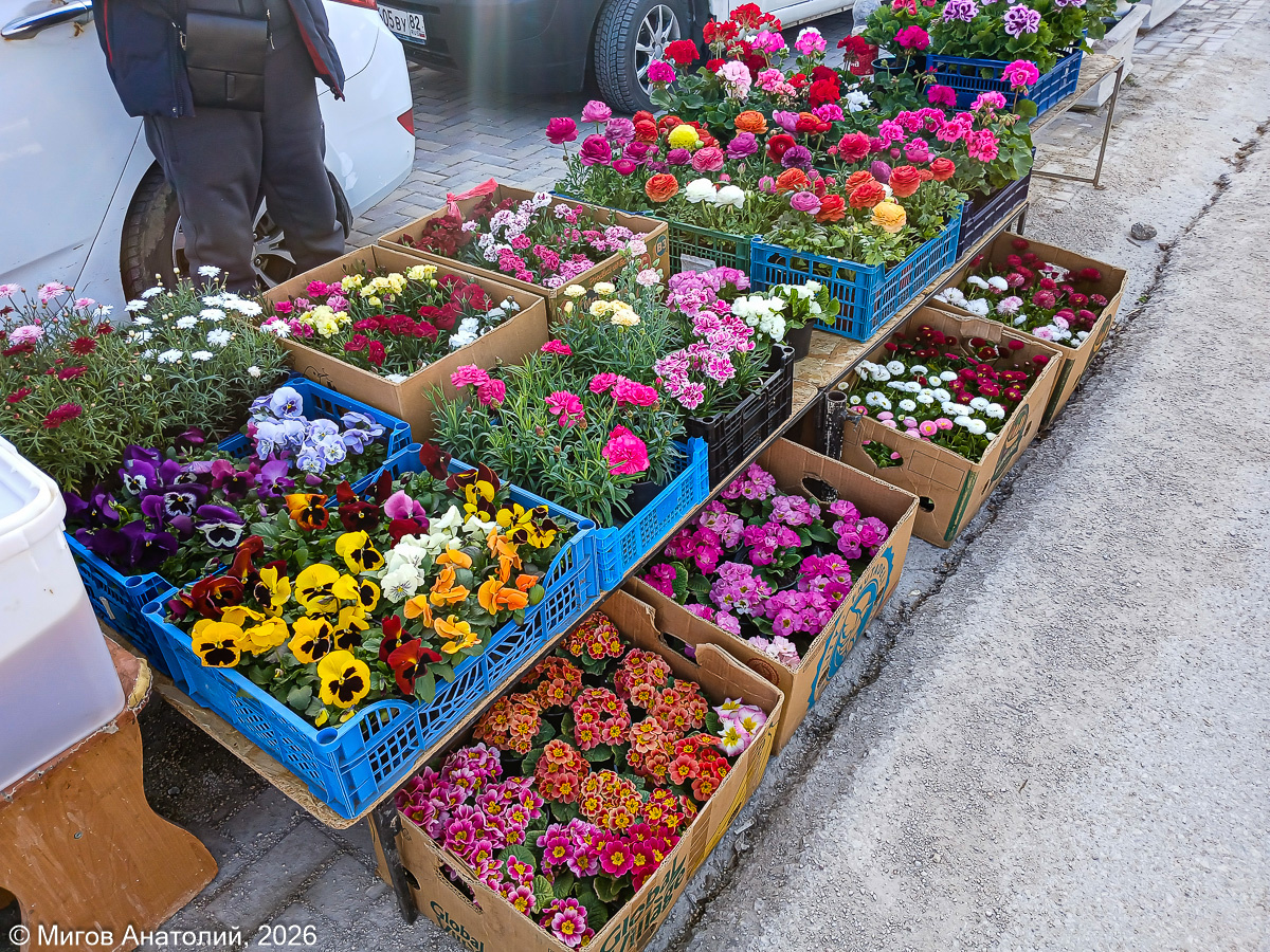 Середина марта - на Старокрымском рынке началось время цветов. Я ещё когда только переехал сюда десять лет назад, удивлялся, вроде бы живут в крымской провинции люди небогато, а на рынке полно цветов. Думаю, неужели кто-то покупает? А потом смотрю, и народ вокруг цветочных продавцов толпится, и с рынка немало людей идет с цветами. Ну и мы с Леной постоянно что-то покупаем здесь. Традиционно саженцы и цветы продают на рыночной площади. Здесь торгуют с колёс по выходным, особенно много продавцов по воскресеньям. Также немало цветочных продавцов можно найти и в разных уголках рынка. Раньше ценников на рынке вообще не было. В последнее время они появились у продавцов овощей и фруктов. А вот цветочники до этого ещё не дошли. Надо подходить и спрашивать цену. Сейчас я расскажу, почем у нас в Старом Крыму можно было купить цветы в воскресенье, 15 марта. Примулы от 100 до 150 рублей. Были ещё мелкие примулы, у которых цветов больше, чем у крупных. Цена та же, 150 рублей за горшочек. Гвоздичка