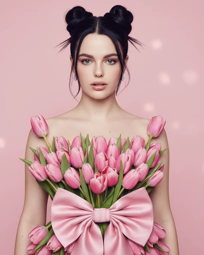 Загрузи свое фото и получи такое же изображение, на котором будешь ты. ✨ Создать фото через сайт ✨ ✨ Создать фото в телеграм боте ✨ Промт для генерации фото: Фэшн-портрет крупным планом вертикального формата: молодая девушка в платье, полностью составленном из пышного букета розовых тюльпанов, стебли и зелёные листья аккуратно уложены, большая атласная розовая лента, завязанная в шикарный бант спереди. Фон пастельно-розовый, минималистичный, без текстур. Прическа — две аккуратные пучка-бабочки на макушке, тонкие пряди у лица. Естественный лёгкий макияж, элегантные серьги в тон. Стиль — глянцевый фэшн-редакшн, вулгарности нет, утонченность и романтика. Освещение мягкое студийное, равномерное заполняющее свет плюс лёгкий контровой свет для... Все промты для ИИ на нашем сайте и в телеграм канале #гламур #реалистичный #весна #романтичное #цветы #женщина
