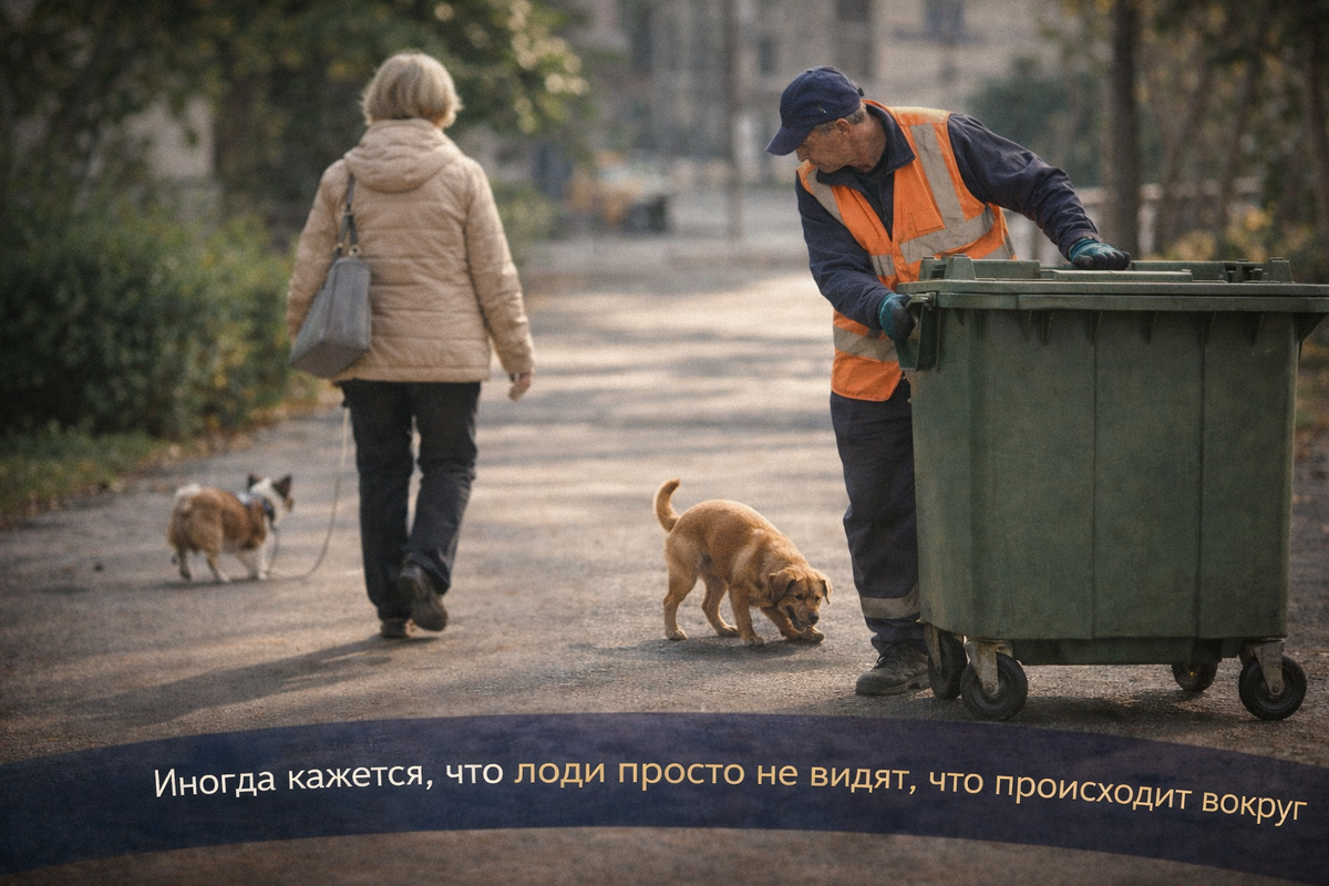 Посмотрел — всё ли нормально. А хозяйка собак продолжает идти дальше. Она даже не повернула голову. Как будто ничего не произошло. И в этот момент у меня возникла странная мысль. Иногда кажется, что люди просто не видят, что происходит вокруг. Как будто внимание направлено куда-то далеко. Мы идём по улице. Едем в транспорте. Разговариваем. Но иногда будто находимся не там, где находится наше тело. Возможно, дело не в равнодушии. А в состоянии. Иногда внимание очень узкое. Иногда —