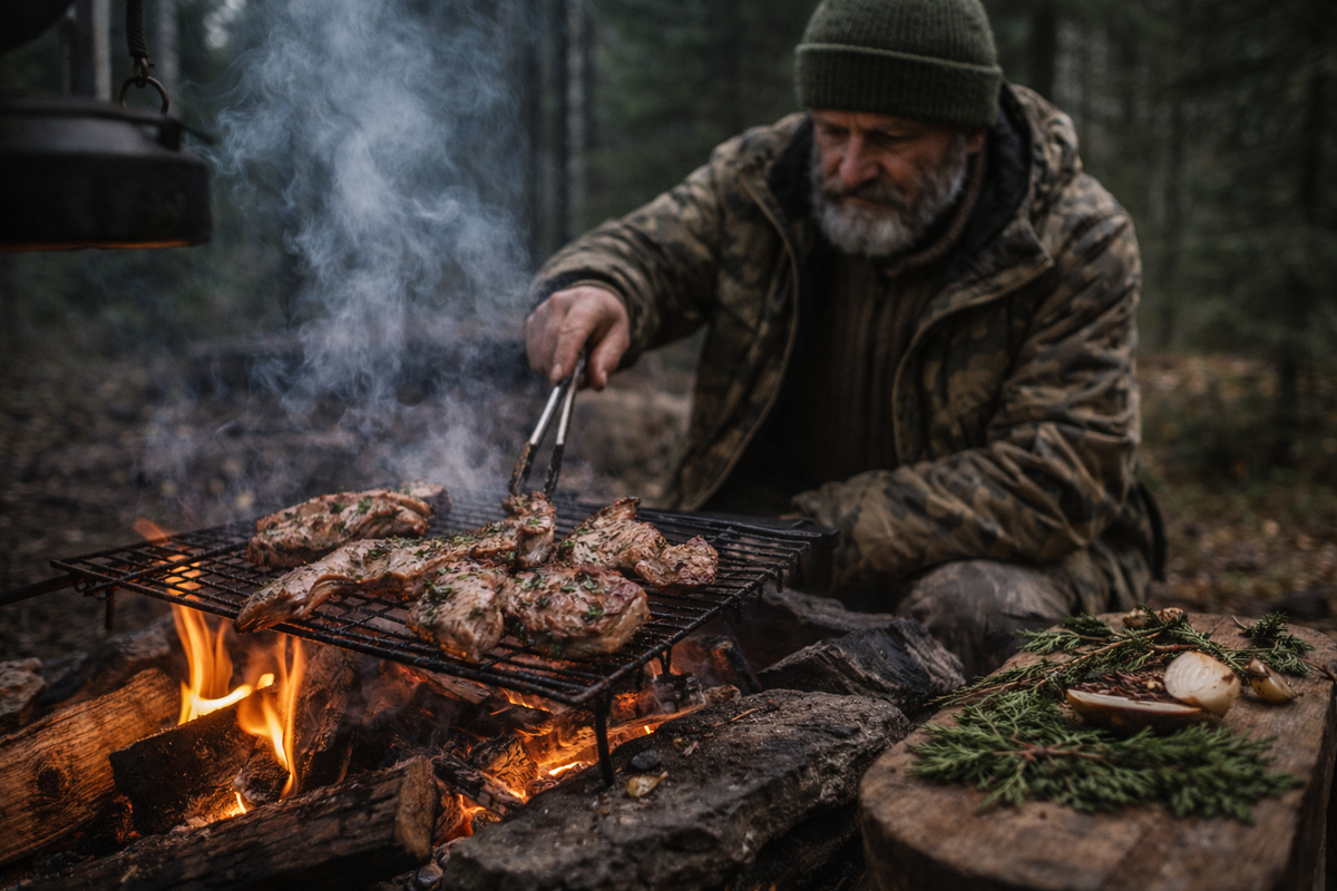 Через сорок–пятьдесят минут мясо готово. Корочка золотистая, аромат сильный, а внутри мясо остаётся сочным. Охотник снимает куски зайца с решётки и кладёт их на деревянную доску. Несколько минут мясо отдыхает, чтобы соки распределились внутри.