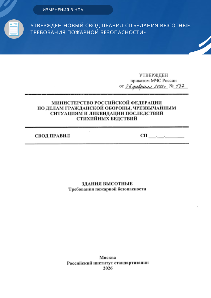 Утвержден новый свод правил СП «Здания высотные. Требования пожарной безопасности» (приказом МЧС России от 26.02.2026 № 137). Текст документа Документ устанавливает требования пожарной безопасности, подлежащие применению при проектировании, изменении функционального назначения, а также при выполнении работ по реконструкции, капитальному ремонту и техническому перевооружению — в пределах объема соответствующих работ — зданий класса функциональной пожарной опасности Ф1.3 высотой более 75 м и зданий общественного назначения (в том числе многофункциональных) высотой более 50 м. Новый свод правил вступает в силу с 1 июня 2026 года. В настоящее время продолжает действовать свод правил со схожим наименованием и аналогичной областью применения — СП 477.1325800.2020 «Здания и комплексы высотные. Требования пожарной безопасности», разработанный Минстроем. Данный документ включен в Перечень документов в области стандартизации, применение которых на добровольной основе обеспечивает соблюдение тре