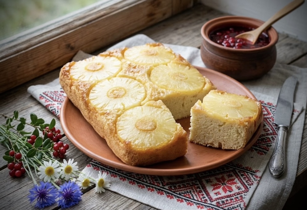 Она получается лёгкой, воздушной и очень ароматной. Сладкое бисквитное тесто прекрасно сочетается с лёгкой фруктовой кислинкой, а золотистые кольца ананаса на поверхности делают пирог особенно красивым.