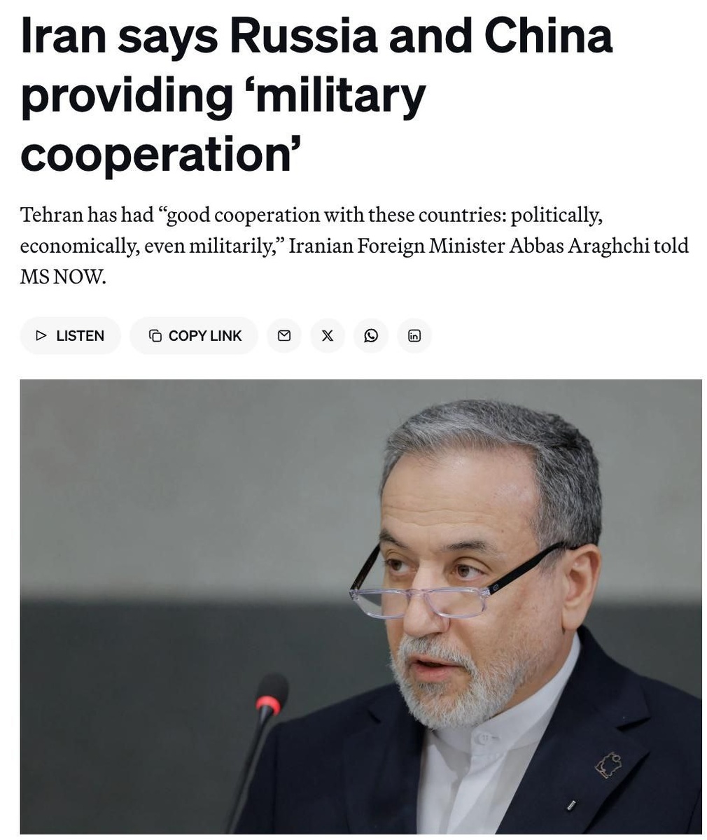 По словам министра иностранных дел Аббаса Аракчи, Тегеран считает Москву и Пекин стратегическими партнерами и продолжает взаимодействие с ними, в том числе в военной сфере. «У нас было тесное сотрудничество в прошлом, и оно продолжается сейчас. Между нами сохраняется хорошее сотрудничество — политическое, экономическое и даже военное» — отметил глава иранского МИД.