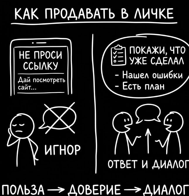 #продажи #маркетинг #лидогенерация Как выглядело бы сильнее? Не просить ссылку на сайт. А сначала показать, что ты уже сделал первый шаг сам. Например так: "Посмотрел ваш сайт. Увидел 3 вещи, из-за которых вы можете терять поисковый трафик и заявки. 1. Нет нормальной проработки посадочных страниц под ключевые запросы 2. Слабая внутренняя оптимизация по структуре и мета-данным 3. Не увидел блоков, которые усиливают конверсию из SEO и GEO-трафика Если хотите, распишу короткий план, что исправить в первую очередь". Вот это уже другой уровень. Почему? Потому что здесь человек видит: 1. внимание к себе 2. предметность 3. компетенцию 4. пользу еще до продажи И именно это отличает сообщение, которое игнорируют, от сообщения, на которое отвечают. Хочешь продавать через личку - не начинай с запроса. Начинай с пользы. Не проси человека сделать шаг, если сам еще не доказал, что с тобой вообще есть смысл разговаривать. Алгоритм: 1. Сначала польза. 2. Потом доверие. 3. Потом диалог. ---