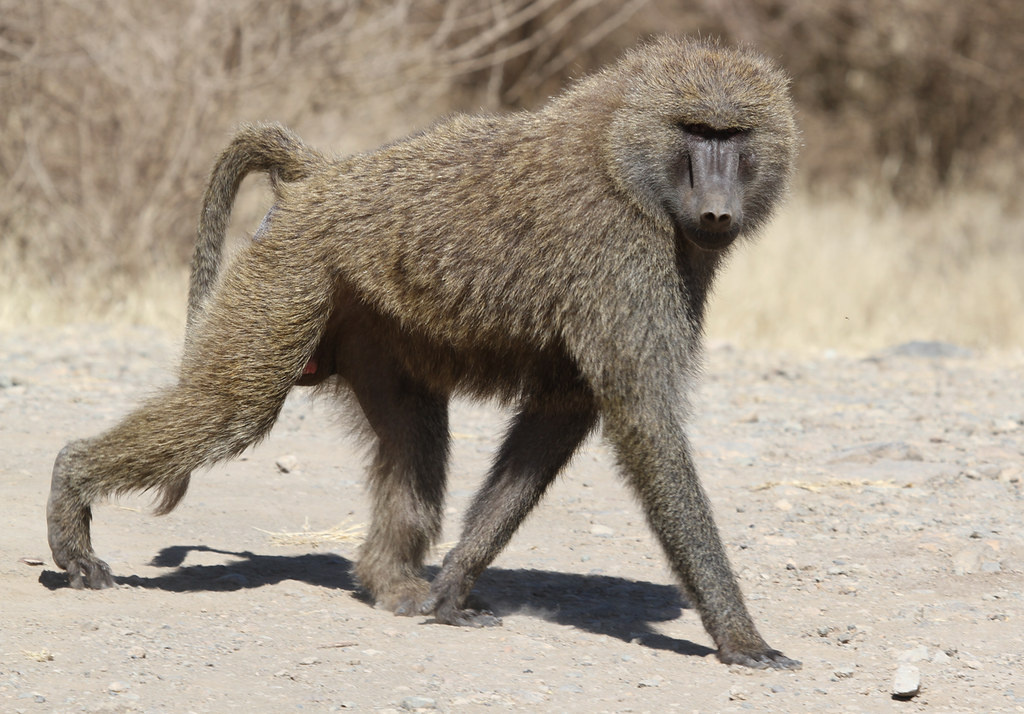 - Внешние особенности: Характерная черта бабуинов – вытянутая морда, напоминающая собачью, с мощными челюстями и острыми клыками. Шерсть у них густая, окрас варьируется от серовато-бурого до темно-коричневого, часто с более светлой гривой у самцов. У многих видов есть ярко окрашенные участки кожи на морде и ягодицах, которые играют роль в коммуникации.