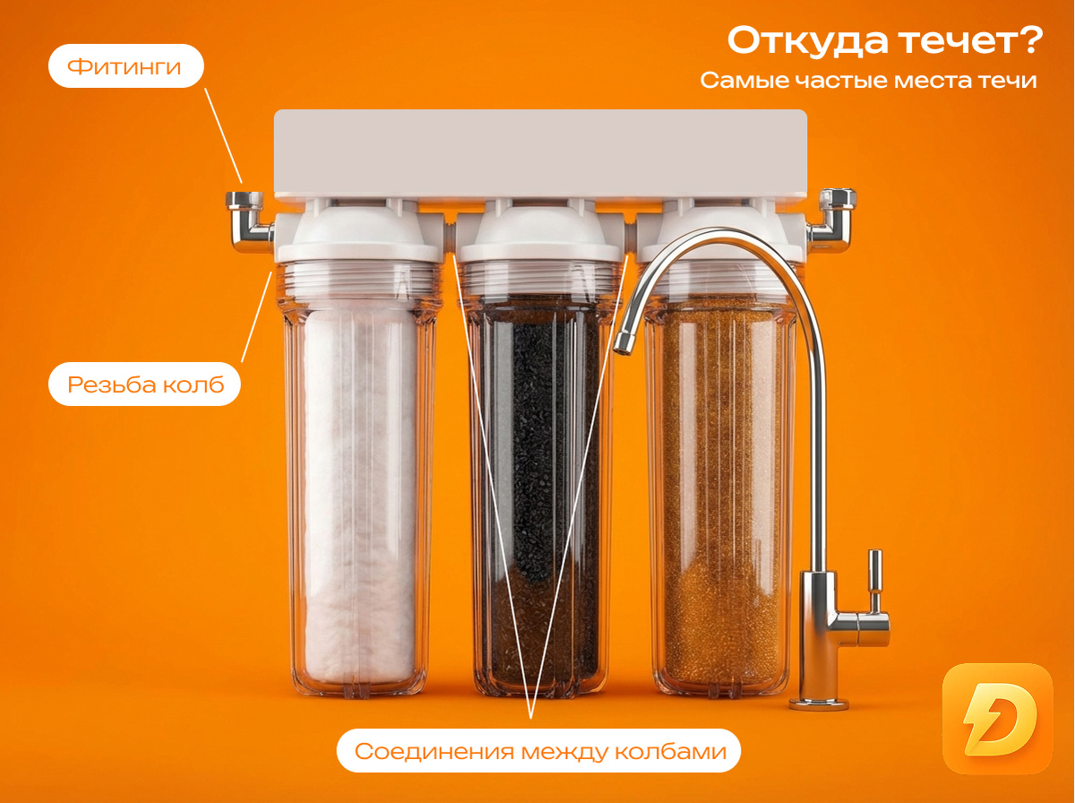 Фильтр для воды под мойкой обычно вспоминают только в момент замены картриджей. Всё остальное время он тихо работает где-то в глубине кухонного шкафа. Именно поэтому небольшая протечка часто остается незамеченной. Сначала это просто редкая капля. Потом влажная тряпка под фильтром. А иногда хозяева обнаруживают проблему только тогда, когда внутри тумбы уже пахнет сыростью, а на дне появляется лужа. Самый частый вопрос в этот момент — можно ли просто подтянуть фильтр самому и забыть о проблеме. Иногда да. Но намного чаще всё оказывается сложнее. 1000 ₽ на первый заказ в Дели Дела — приятная скидка, если решите вызвать мастера вместо самостоятельного ремонта.