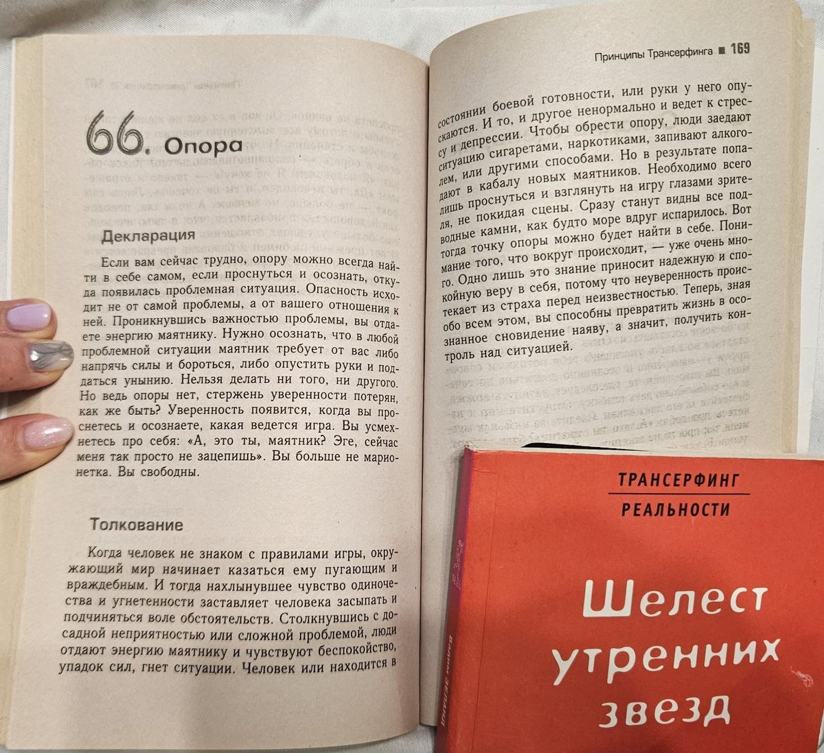 66/78 Практикум управления реальностью - Трансерфинг Опора "Если вам сейчас трудно, опору всегда можно найти в себе самом, если проснуться и осознать, откуда появилась проблемная ситуация. Опасность исходит не от самой проблемы, а от вашего отношения к ней. Проникнувшись важностью проблемы, вы отдаете энергию маятнику. Нужно осознать, что в любой проблемной ситуации маятник требует от вас либо напрячь силы и бороться, либо опустить руки и поддаться унынию. Нельзя делать ни того, ни другого. Но ведь опоры нет, стрежень уверенности потерян, как же быть? Уверенность появится, когда вы проснетесь и осознаете, какая ведется игра. Вы усмехнетесь про себя: "А, это ты, маятник?" Эге, сейчас меня так просто не зацепишь". Вы больше не марионетка. Вы свободны." "Когда человек не знаком с правилами игры, окружающий мир начинает казаться ему пугающим и враждебным. И тогда нахлынувшее чувство одиночества и угнетенности заставляет человека засыпать и подчиняться воле обстоятельств. Столкнувшись с