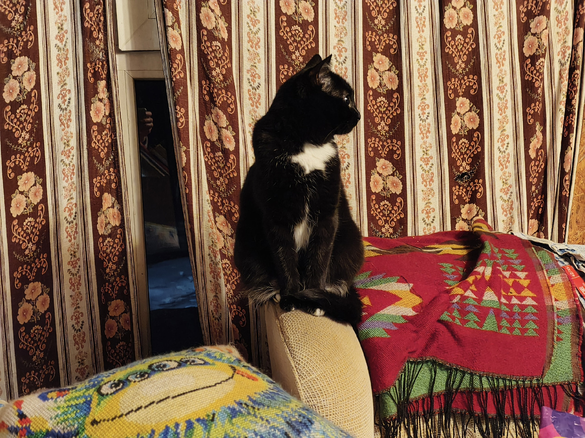 Стая подняла гвалт. В раздававшемся многоголосье я отчетливо различила басы Кваса: кто-то из зверья ходил недалеко от дома, и собаки предупреждали, что это их территория и соваться сюда не следует. Они выполняли свою задачу, ситуация была штатная, поэтому я прислушалась, оценила обстановку и продолжила читать. Маслина лежала на моем пончо, висевшем на спинке кресла, и дремала. Услышав тревожный лай стаи (а наши звери, долго проживающие на одной территории, даже принадлежа к разным видам, хорошо научились распознавать и «переводить» сигналы друг друга), кошка тут же открыла глаза и заворчала. Сначала я подумала, что она выражала недовольство тем, что ее разбудили. Но не тут-то было! Кошка встала и принялась оглядываться и прислушиваться к обстановке. Она понимала, что потенциальная угроза находится не внутри дома, но все равно беспокоилась. Тревога не унималась, и кошка пошла к окну, стала смотреть за шторы, вглядываясь в темноту, туда, куда лаяли собаки. И не забывала при этом утробно
