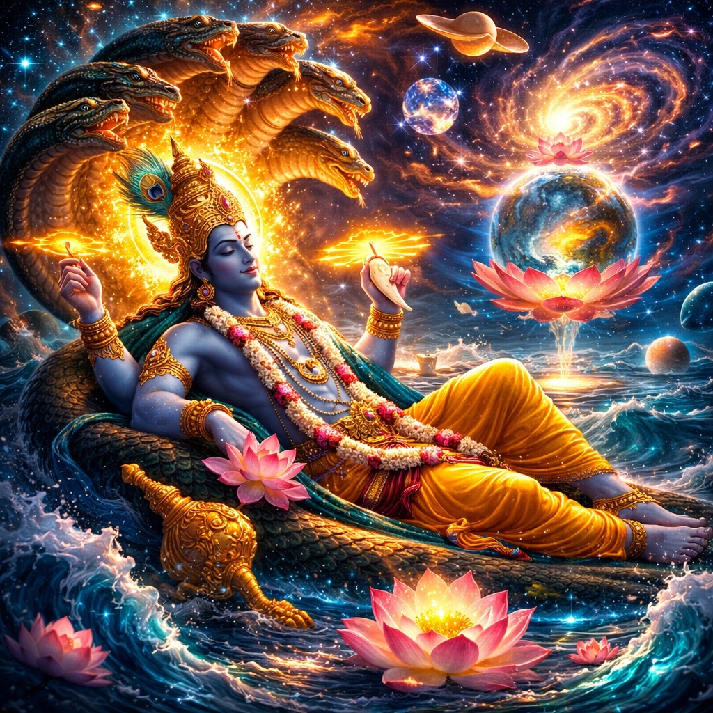 И вот здесь начинается настоящий масштаб темы. Потому что если Кришна может казаться ближе, Рама — понятнее, а Вишну как хранитель дхармы — яснее по функции, то Нараяна открывает совсем другой уровень. Это уже не просто религия. Это метафизика, мифология и космос, сплетённые в один образ.