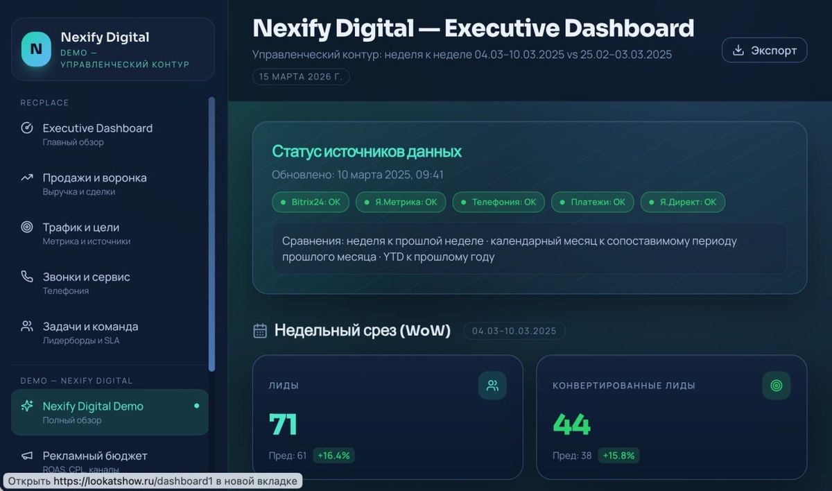 Для меня, как для маркетолога отчеты всегда были головной болью. Исходя из принципа «если ты что-то не умеешь, то начни этому учить» у меня даже была школа BI-аналитики, где я был младшим партнером. У нас в клиентах был аж центральный банк ЕС, России, Армении, КАМАЗ, Аэрофлот и еще много кто. Но скажу честно, что за 13 лет работы в маркетингу у меня никогда не было нормальных отчетов. До сегодняшнего дня. При помощи нейронок мы сделали реально полезный, практичный и нужный дашборд. Какая задача передо мной стояла: Запилить нормальный управленческий дашборд для агентства: чтобы в одном экране видеть всё — лиды, сделки, выручку, рекламный бюджет и его эффективность, конверсии по воронке, откуда приходят клиенты, как работает команда. Звучит как задача на пол ляма и месяц работы подрядчика. Но все было решено за 30 минут. Вот как мы решили задачу (Дальше будет немного технических терминов. Если вам лень в них разбираться и что-то непонятно – пишите мне в личку, я помогу вам) Шаг 1 Сбор