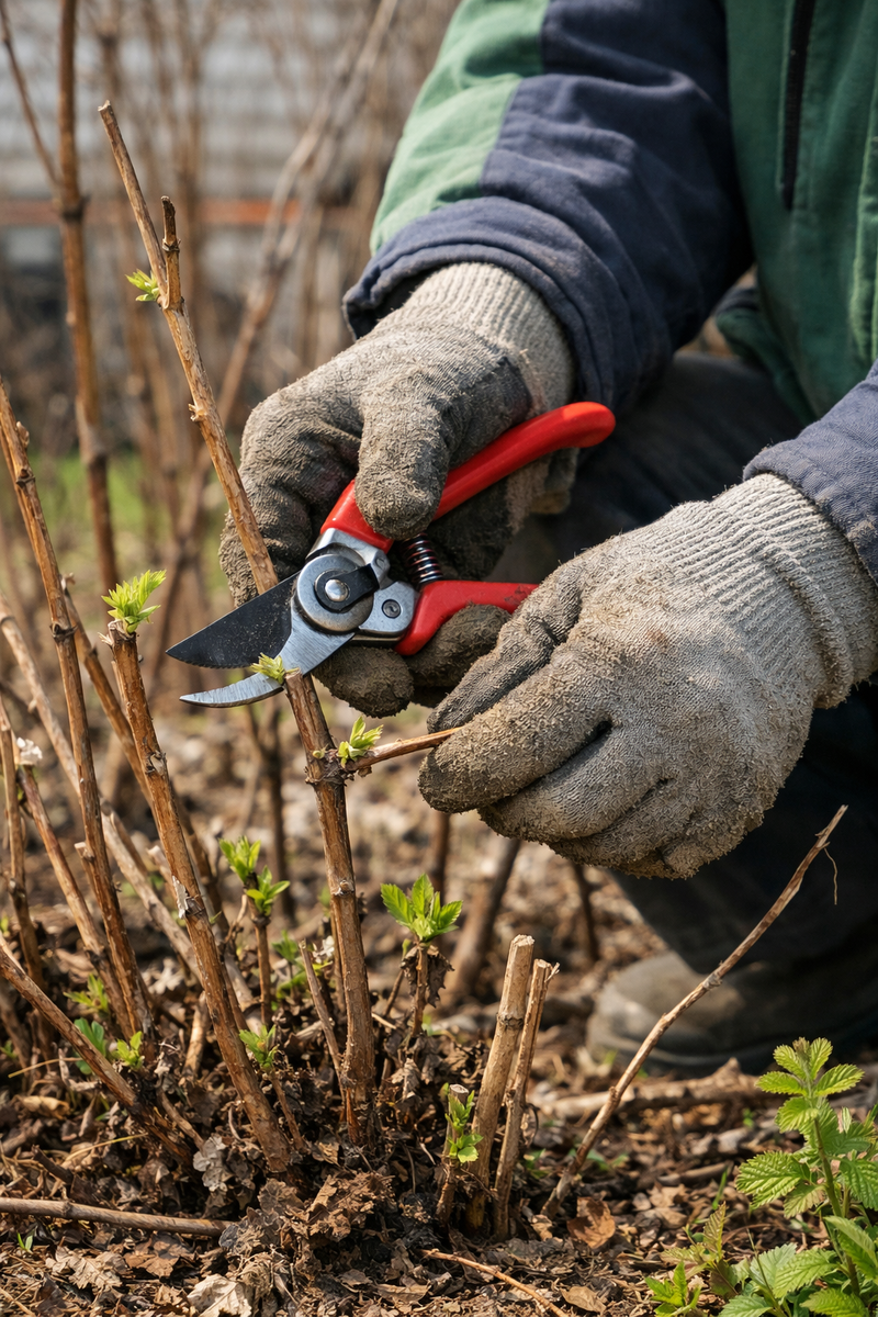 Первым делом я надеваю плотные перчатки (малина колючая!) и вооружаюсь острым секатором. Начинаю с самого очевидного — удаляю всё, что точно не даст урожая: