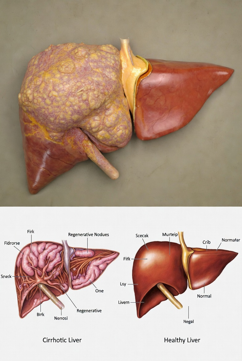 · Фиброз и Цирроз: Клетки печени (гепатоциты) массово погибают и замещаются рубцовой (фиброзной) тканью. Печень перестает выполнять свои функции. Это состояние необратимо.