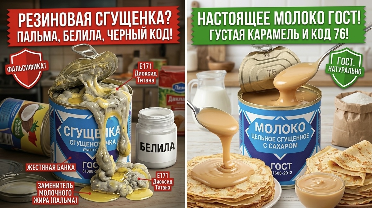 3. Ловушка названия. Запомните: ГОСТ защищает только фразу «Молоко цельное сгущенное с сахаром». Если на банке написано просто «Сгущенка», «Сгущеночка», «Варенка» или «Сгущенное молоко ГОСТ» (но без слова цельное) — перед вами легализованный фальсификат (ЗМЖ — заменитель молочного жира).