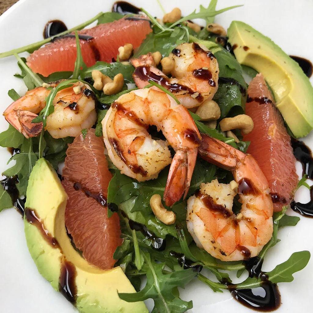 Необычные салаты с креветками в сочетании с экзотическими фруктами. Три необычных рецепта. Эти салаты — не просто еда, а настоящее гастрономическое приключение! Каждый рецепт — это гармония нежного морского вкуса креветок и сочных тропических нот: горьковатой свежести грейпфрута, бархатистой сладости манго или яркой кислинки ананаса. Нежные креветки, спелое авокадо, яркая рукола и освежающий грейпфрут создают идеальное сочетание вкусов. Бальзамический соус добавляет пикантную нотку, делая салат настоящим удовольствием для гурманов. 💚 Легкий, полезный и красивый — идеальный выбор для тех, кто ценит вкус и заботится о себе! Ингредиенты: • Креветки — 200 г • Розовый грейпфрут — 1 шт. • Рукола — 50-80 г • Авокадо - 1 шт. • Кедровые орехи (кешью, арахис или другие) — 2 ст. л. • Бальзамический уксус — для украшения • Оливковое масло — немного, для обжарки • Соль и перец — по вкусу Приготовление: обжарьте креветки на масле 2–3 минуты. Грейпфрут очистите и нарежьте дольками, удалив все пленк