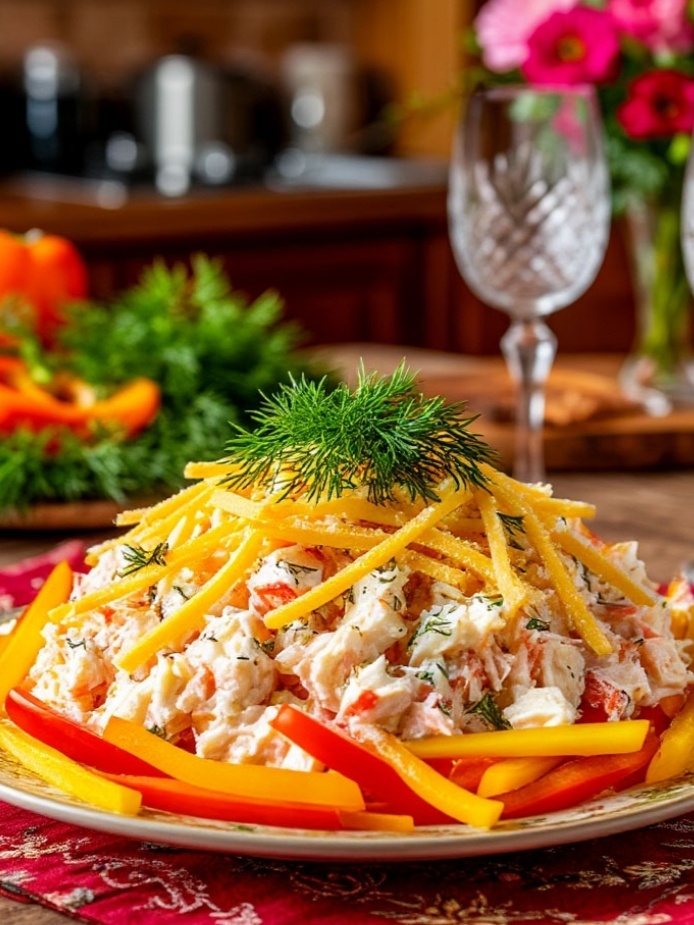 Я называю это блюдом весенней лёгкостью — оно яркое, свежее, не перегружено. Выглядит эффектно, а готовится за считанные минуты. Ключевой элемент — крабовые палочки. Вместо нарезки их нужно аккуратно раскатать скалкой прямо на разделочной доске, после чего легко разобрать руками на нежные нити. Такие волокна придают салату особую текстуру и визуальную привлекательность.