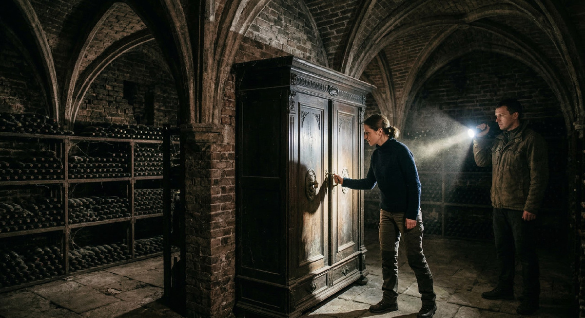 У стены стоял шкаф. Огромный, высотой почти до потолка, из тёмного, почти чёрного дуба, с бронзовыми ручками на тяжёлых дверцах. Он выглядел здесь абсолютно чужеродным — слишком домашний, слишком нарядный для сурового каменного подвала. Его явно притащили сюда специально, и давно — пыль на нём лежала такая же плотная, как и на всём вокруг.
