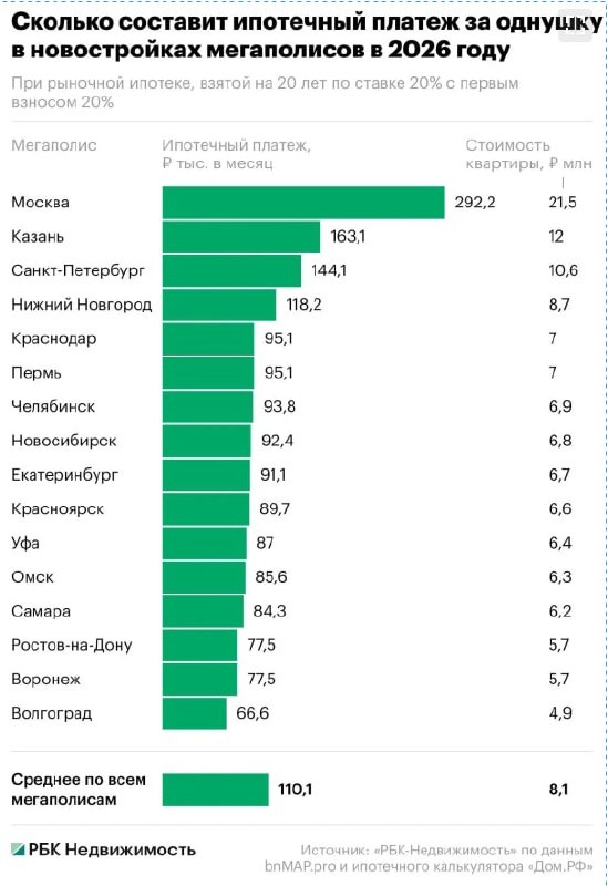 ? На днях «РБК Недвижимость» выкатили интересные данные по ипотеке в мегаполисах. Цифры по стоимости жилья и платежей по стране отличаются в разы. В принципе, как и зарплаты👇 Москва Средняя однушка в новостройке столицы стоит 21,5 млн ₽. Если взять ипотеку на 20 лет под 20% с первым взносом 20%, вы будете платить 292 200 ₽ в месяц. Это выше, чем средняя зарплата по стране в 2–3 раза. Казань и Питер 🔹 Казань - 12 млн ₽, платеж 163 100 ₽/мес. Квартиры здесь просторные (39,2 кв. м), но и цены соответствующие. 🔹 Санкт-Петербург - 10,6 млн ₽, платеж 144 100 ₽/мес. Зато метраж самый маленький среди миллионников - 32,2 кв. м . Волгоград Однушка в новостройке Волгограда стоит 4,9 млн ₽ - это в 4 раза дешевле московской. Платеж по ипотеке тоже более приятный - 66 600 ₽/мес. Хотя для многих регионов и такие цифры могут быть неподъемными. Остальные города В 12 из 16 миллионников платеж ниже 100 тыс. ₽: 🔸 Ростов-на-Дону, Воронеж - около 77 500 ₽ 🔸 Краснодар, Пермь, Челябинск, Новосибирск