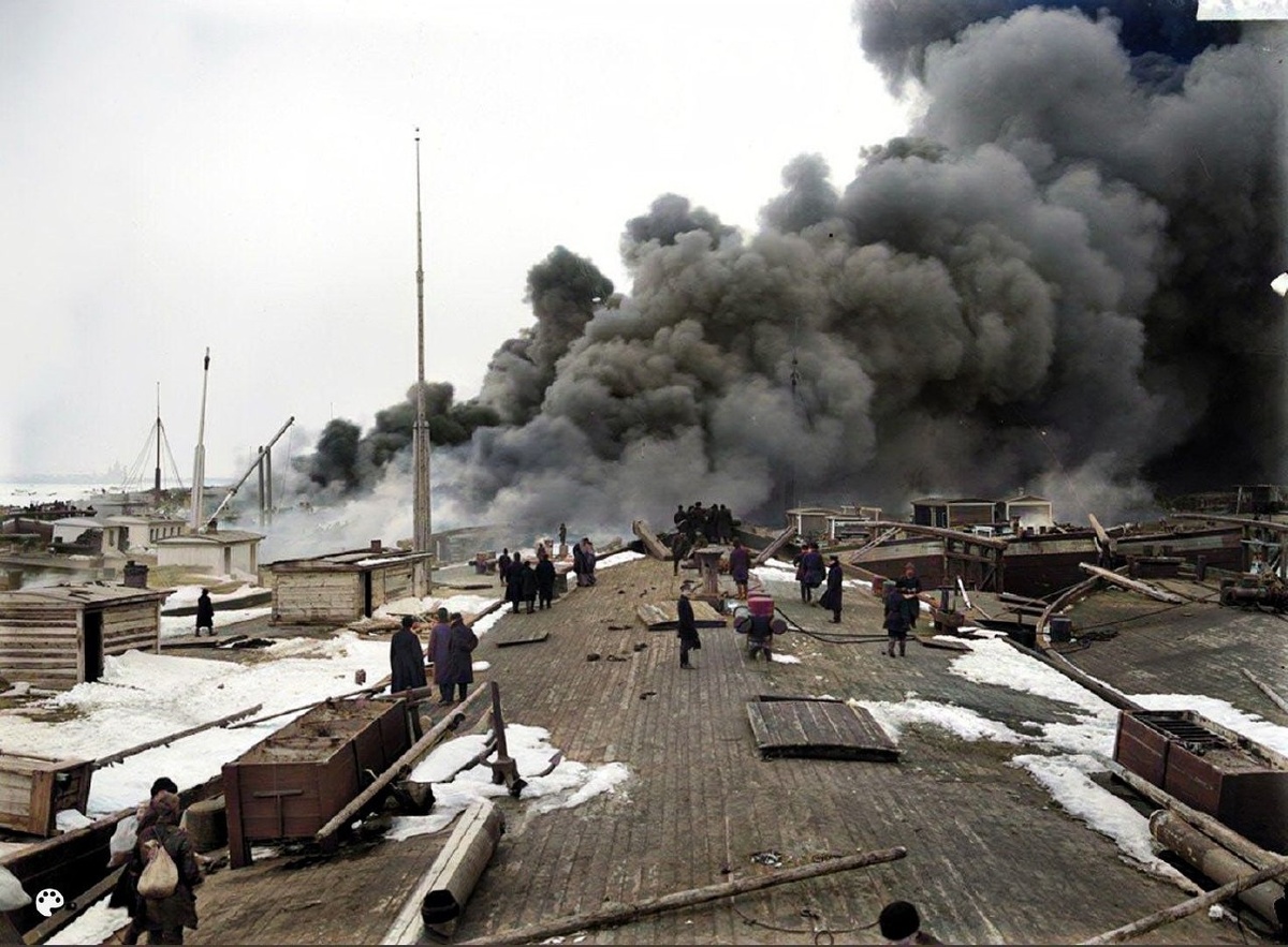 Загорелся огромный караван нефтяных барж, зимовавших в этом затоне. Катастрофа началась ночью.. Загорелось на нефтекачке — наливной барже с приспособлением для переливания нефти в пароходы. Каким образом возник огонь — осталось невыясненным. На нефтекачке, как и на каждой нефтяной барже, имелись кое-какие огнегасительные средства (ящики с землей и пр.), и поэтому некоторое время борьба с огнем велась довольно успешно, а пламя как будто совсем погасло. Но в 4 часа утра оно вновь сразу выступило в нескольких местах, и настолько энергично, что люди, тушившие пожар. еле успели убежать с палубы. Нефтекачка вспыхнула, как костер, а от нее огонь перешел на соседние баржи — нефтяные и хлебные,— и часа через полтора весь огромный караван барж, плотно замерзших во льду пустующего затона, был объят пламенем. Колоссальные клубы черного, густого дыма Репост из источника
