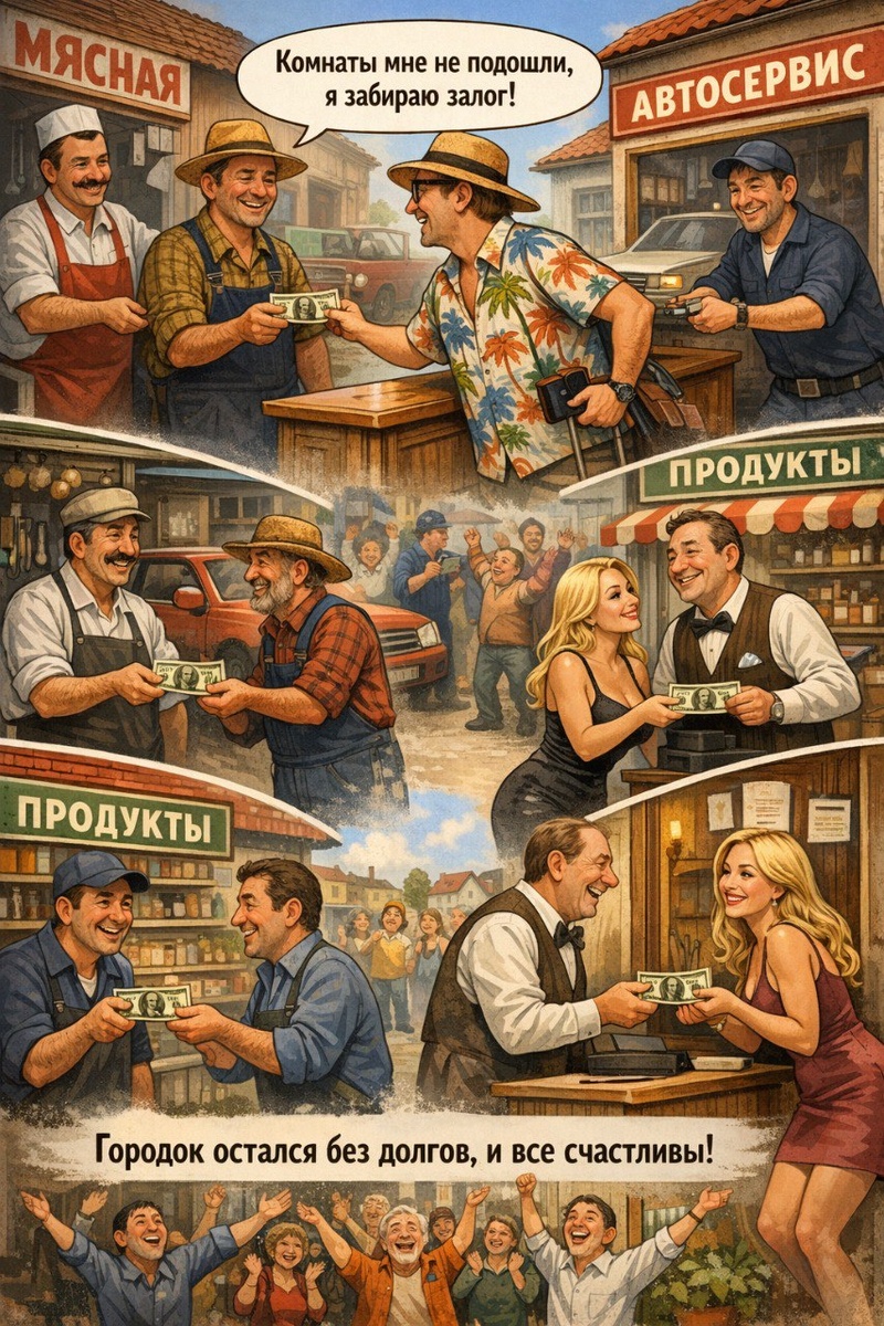 Как один турист спас экономику маленького городка Один богатый турист приехал в маленький городок. Зашёл в гостиницу, оставил хозяину 100 долларов залога и сказал: • Пойду посмотрю номера. Пока гость поднимался по лестнице, хозяин гостиницы схватил купюру и побежал к мяснику. • Вот, держи. Возвращаю долг. Мясник взял деньги и побежал к фермеру. • Забери свои деньги за говядину. Фермер тут же отправился к владельцу автомастерской. • Рассчитываюсь за ремонт трактора. Владелец мастерской пошёл в местный магазин. • Вот долг за продукты. Хозяин магазина побежал к местной девушке по сопровождению. • Закрываю старый счёт. Девушка не медля направилась в гостиницу. • Вот деньги за комнаты, которые я снимала для клиентов. И... возвращает те самые 100 долларов хозяину гостиницы. В этот момент по лестнице спускается турист и говорит: • Ничего подходящего не нашёл. Забирает свой залог и уезжает. Итог: Никто ничего не заработал. Но весь город рассчитался с долгами. Экономика ожила. Настроение улучши