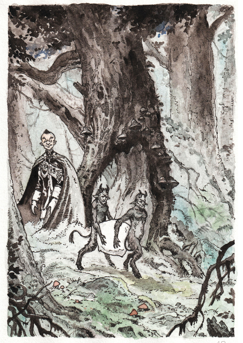 Храпелкин и чертята свернули с тропинки и вышли к спрятавшемуся у корней мощного дерева, шалашу. Раздвинув ветки, закрывающие вход, Храпелкин нырнул внутрь. За ним последовали чертята. Ветки снова сошлись.