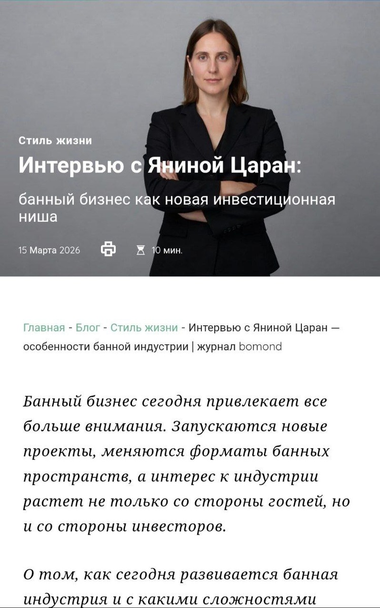 Дала интервью в глянцевом журнале РФ на тему банного бизнеса https://persono.ru/blog/lifestyle/yanina-caran/