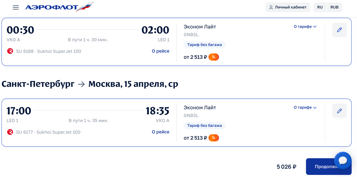 ВАЖНО! Билеты туда-обратно у Аэрофлота обходятся дешевле, чем приобретение их по отдельности, но разные тарифы не комбинируются - нельзя купить в одном бронировании на одном направлении безбагажный тариф Лайт, а обратно - тариф с багажом, только докупать багаж отдельно, что можно обойтись дороже.