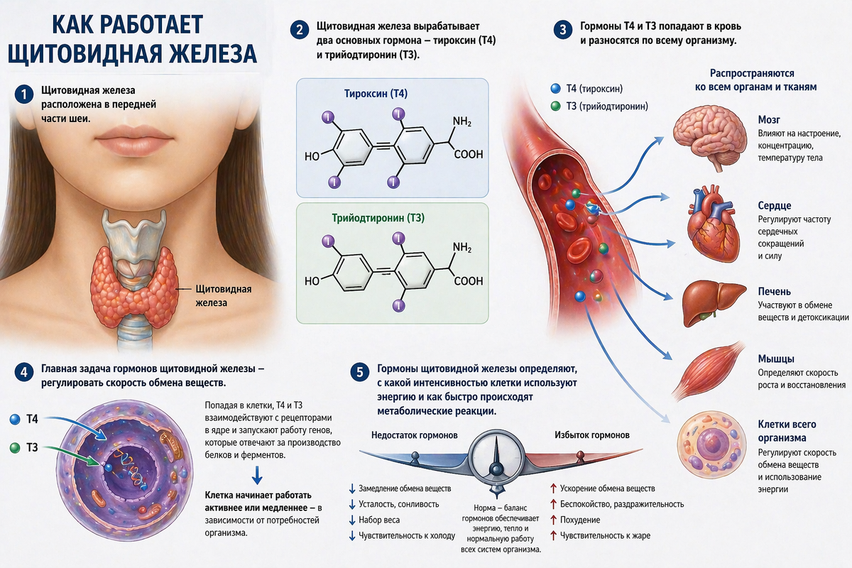 Но на клеточном уровне её распределение во многом регулируется гормональными сигналами. Щитовидная железа играет в этой системе роль одного из главных регуляторов.