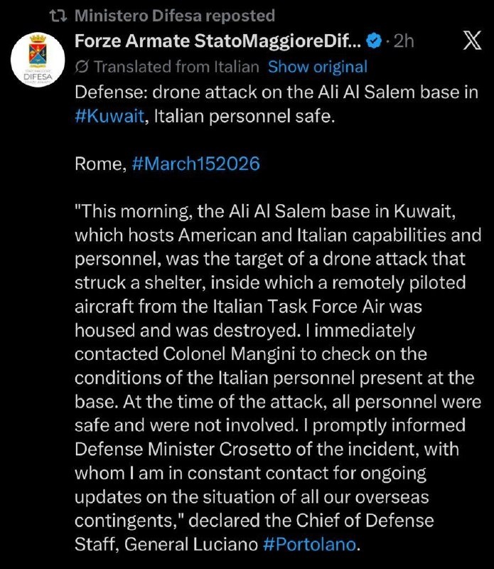 Drone strike in Kuwait destroys ‘indispensable’ Italian military aircraft — Defense Chief