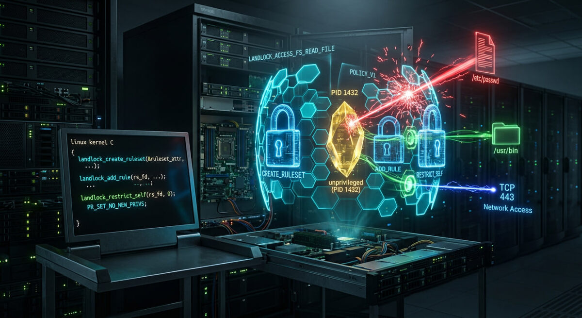 Landlock сломал этот парадокс. Начиная с ядра Linux 5.13, любой непривилегированный процесс может ограничить самого себя, установив правила доступа к файловым иерархиям, не запрашивая ничего у администратора, не требуя предустановленных профилей и не загружая модулей. Три системных вызова, и процесс живёт в клетке, которую сам себе построил. Снять её невозможно физически, только перезапуск процесса освобождает его от наложенных ограничений.