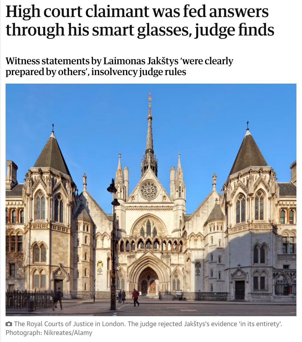 Истец Лаймонас Якстис захотел пойти по очень лёгкому пути и пришёл в суд в смарт-очках, чтобы получать подсказки в реальном времени. На это обратила внимание судья, так как мужчина долго отвечал, были странные помехи вокруг свидетеля, а потом она и вовсе попросила снять смарт-очки. После этого голос уже на громкой связи продолжил отвечать на вопросы. На это мужчина заявил, что ChatGPT включился сам. В итоге показания истца сочли ненадёжными. @lobushkin