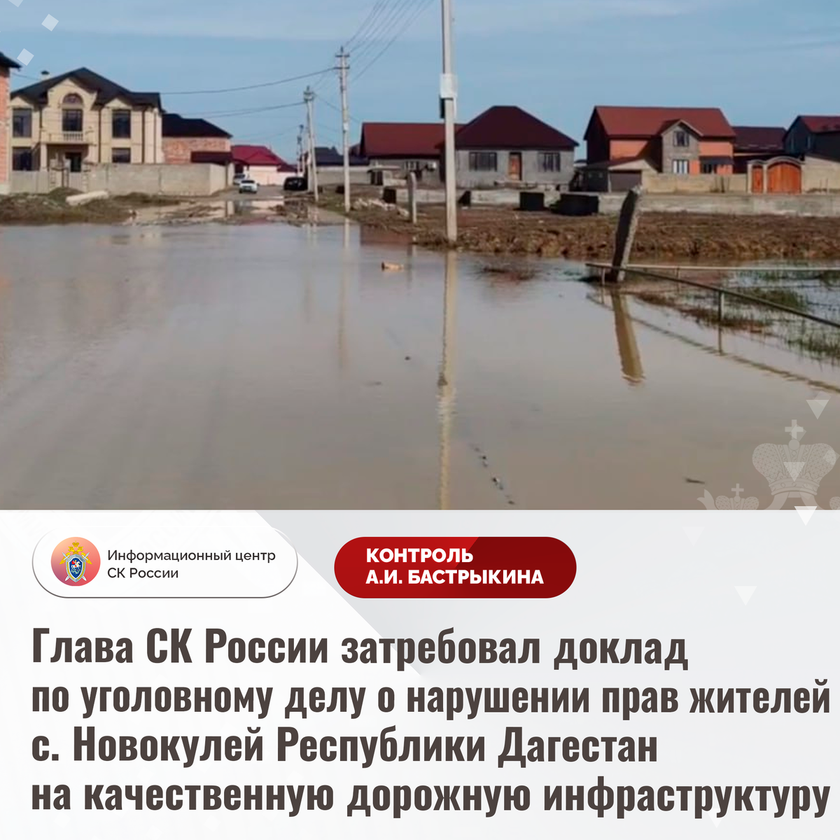 Глава СК России затребовал доклад по уголовному делу о нарушении прав жителей с. Новокулей Республики Дагестан на качественную дорожную инфраструктуру В сети Интернет сообщается о нарушении прав жителей села Новокулей Республики Дагестан на качественную дорожную инфраструктуру. На протяжении длительного времени в связи с отсутствием ливневой канализации и асфальтового покрытия автомобильные дороги в населённом пункте постоянно размываются, на их поверхности образовались многочисленные глубокие ямы и колеи. В результате проезд транспортных средств, в том числе экстренных служб, а также передвижение пешеходов затруднены. Обращения в различные инстанции результатов не принесли. Ранее А.И. Бастрыкин ставил указанную ситуацию на контроль в центральном аппарате ведомства. В СУ СК России по Республике Дагестан расследуется уголовное дело. Председатель Следственного комитета Российской Федерации Александр Иванович Бастрыкин затребовал у руководителя СУ СК России по Республике Дагестан Алексан