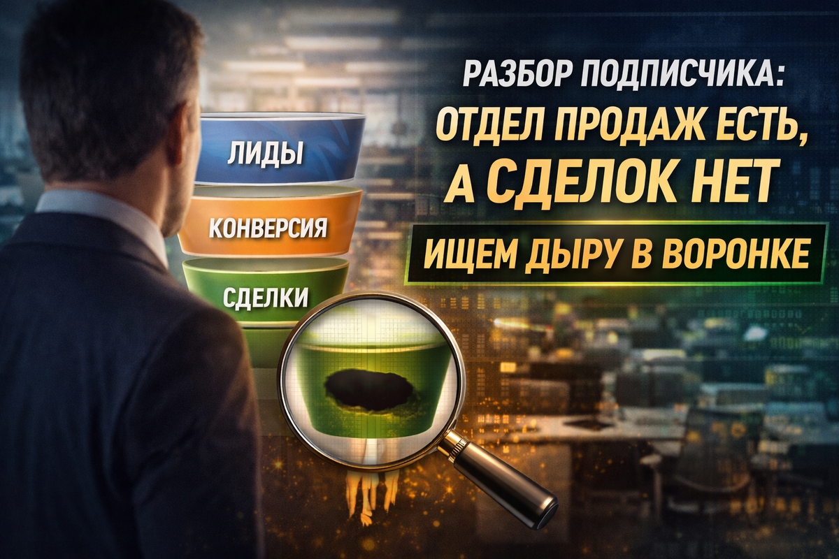 «Олег, у меня компания 7 лет на рынке. Отдел продаж - 12 человек. РОП есть. CRM стоит. Маркетинг льет трафик. Лидов - 300-400 в месяц. А сделок - 30-40. Конверсия упала до 10%. Раньше было 25%. Где дыра? Помоги».