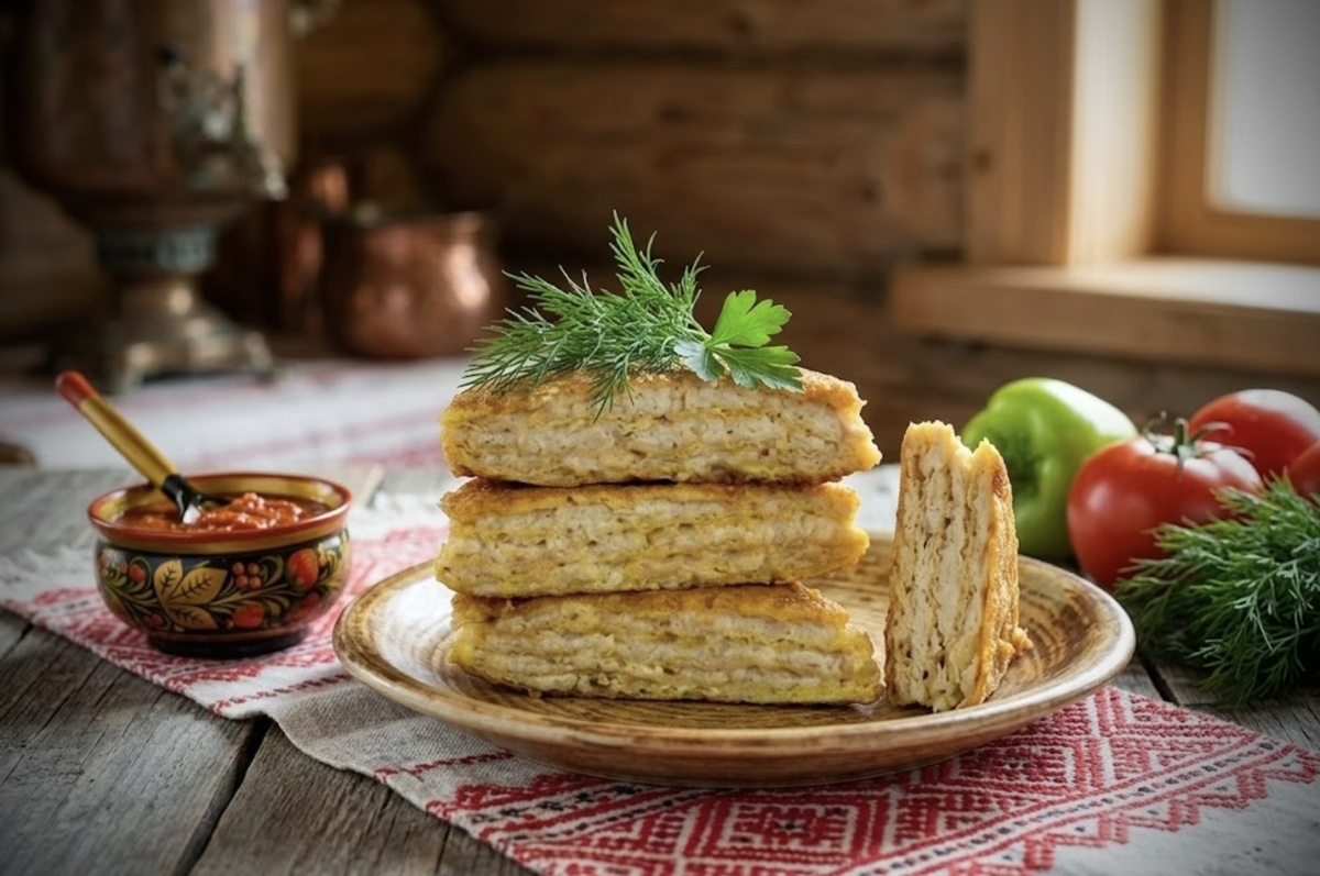 После обжаривания вафельные коржи становятся мягкими и пропитываются мясным соком. Снаружи образуется золотистая корочка, а внутри остаётся сочная и ароматная начинка. По текстуре блюдо напоминает одновременно и мясную запеканку, и горячий пирог.