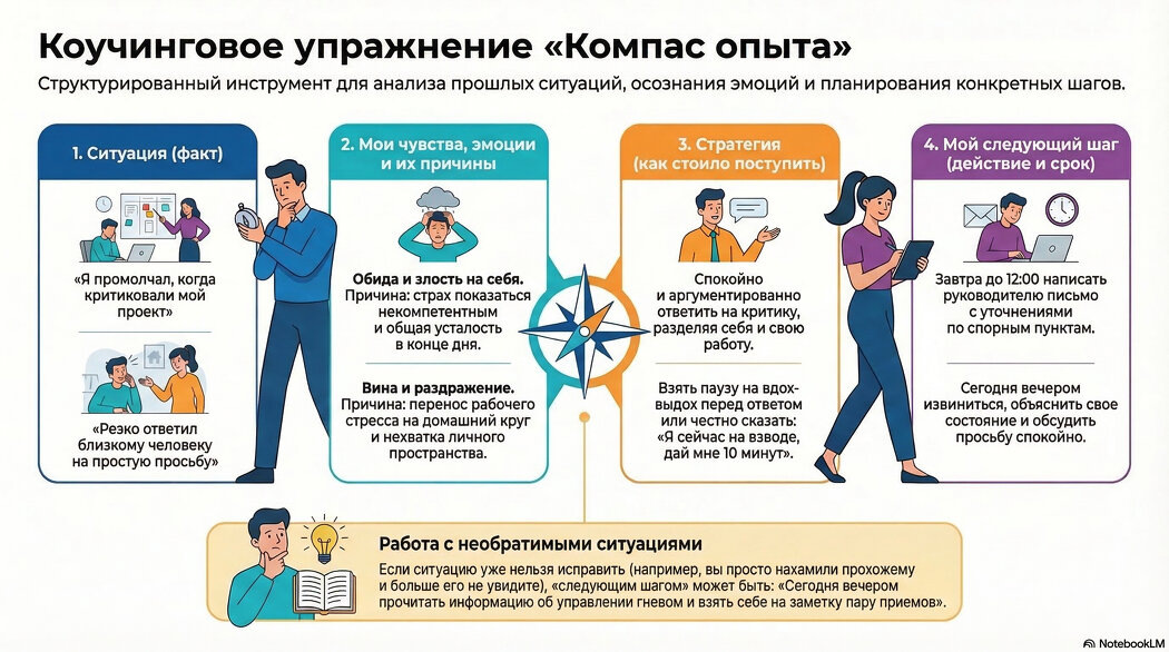 Это упражнение создано для того, чтобы остановить поток навязчивых мыслей о прошлом (то, что психологи называют руминацией) и превратить их в источник полезных выводов. Оно помогает снизить уровень тревоги и перестать бесконечно «пережевывать» одну и ту же ситуацию. Цель упражнения: