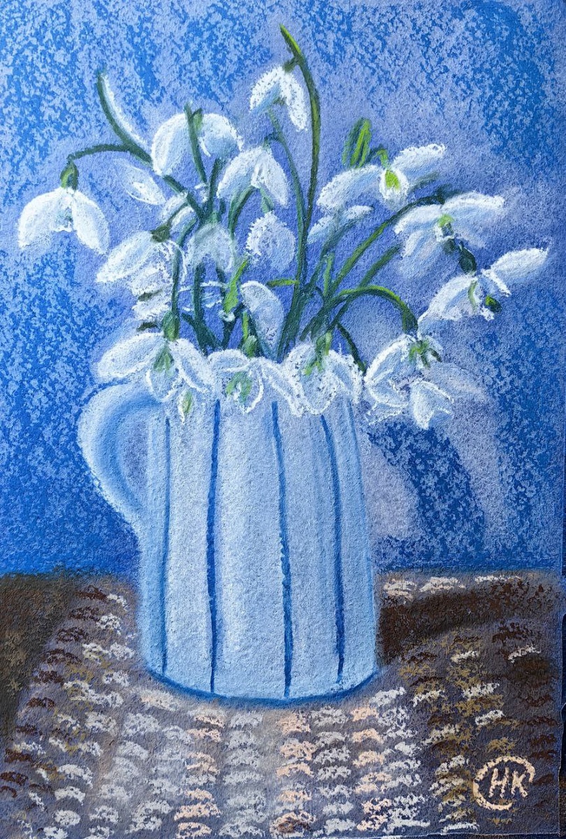 Нарисовала сухой пастелью подснежники в кувшине