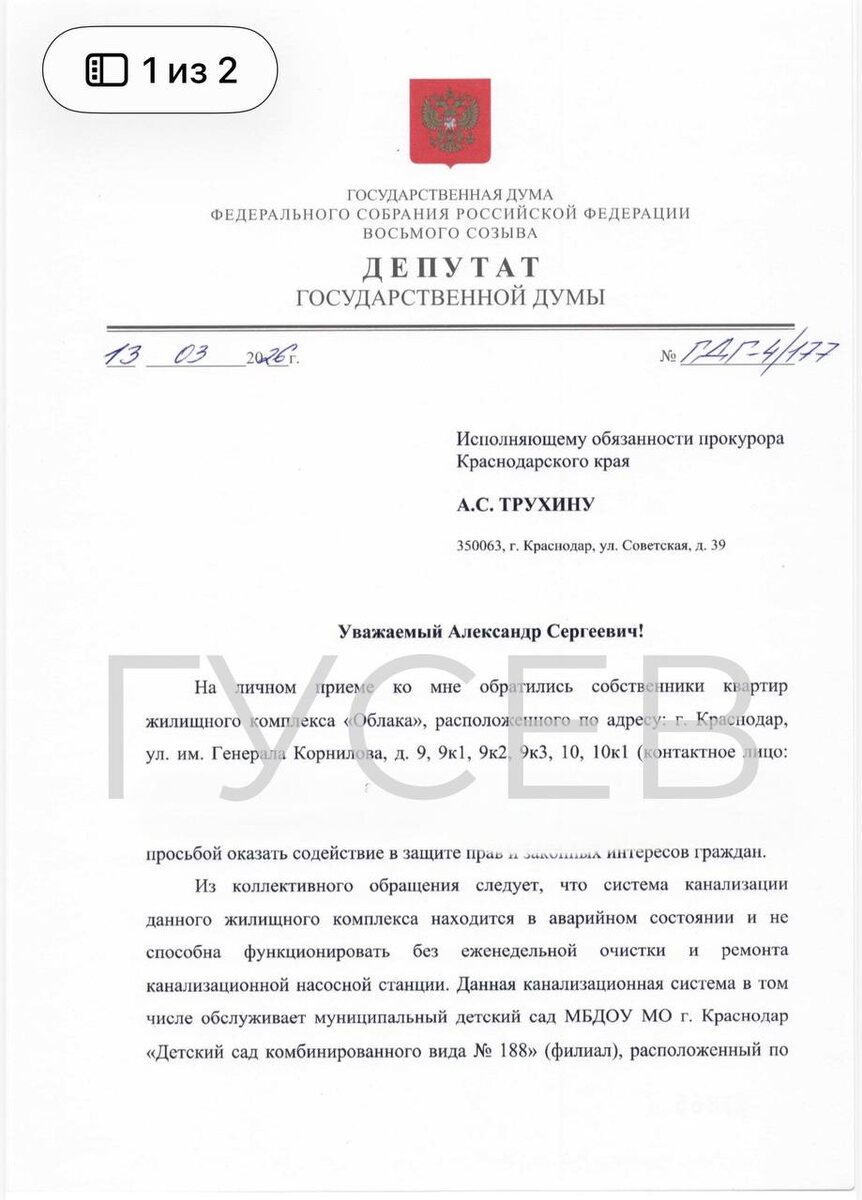 Ранее ко мне на личном приёме обратились жители комплекса. Они рассказали о серьёзных проблемах с системой канализации: канализационная насосная станция находится в аварийном состоянии и фактически работает только за счёт постоянных очисток и аварийных ремонтов. По словам жителей, остановки работы КНС происходят примерно раз в две недели. В декабре прошлого года ситуация резко ухудшилась — аварийные сбои стали практически ежедневными, а люди на два дня остались без водоснабжения. Особую обеспокоенность вызывает и то, что эта система обслуживает не только жилые дома, но и муниципальный детский сад. По итогам обращений направил депутатские запросы главе Краснодара и в прокуратуру Краснодарского края с просьбой провести проверку и принять меры реагирования. Держу ситуацию на контроле.