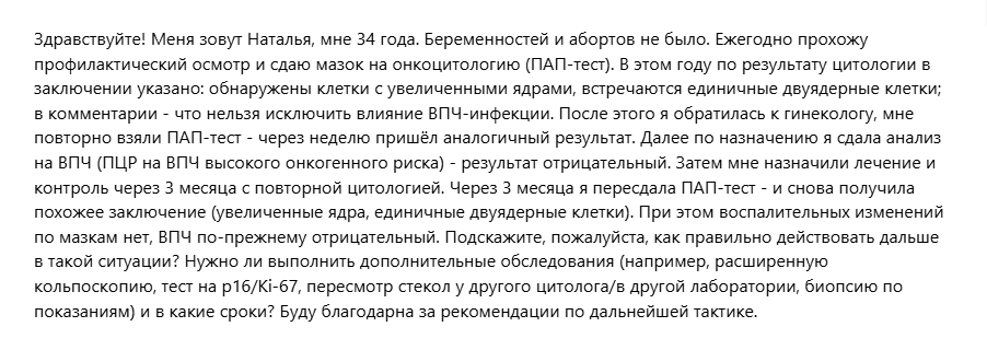 И самое важное: точный ответ по вашей ситуации я даю после сбора полного анамнеза и просмотра документов целиком: формулировки онкоцитологии (ASC-US/LSIL и т.д.), протокол кольпоскопии, тип ВПЧ-теста (панель/метод), результат гистологии, лечение, жалобы и осмотр. Тогда получается спокойный персональный план — без лишних анализов и без пропусков по контролю.