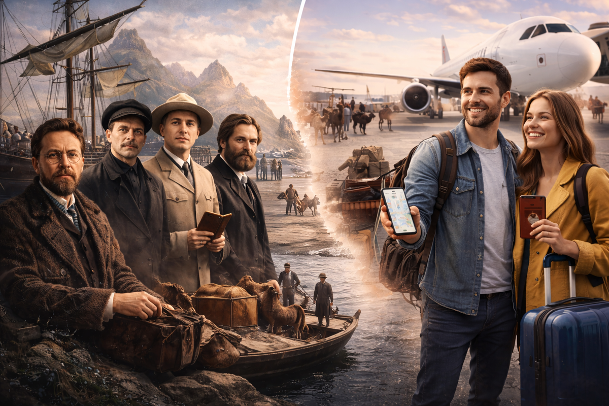 В наши дни это один перелёт. Да, дорогой тур, да, не каждый себе позволит сейчас. А тогда и подавно, дорога только в одну сторону занимала три месяца!