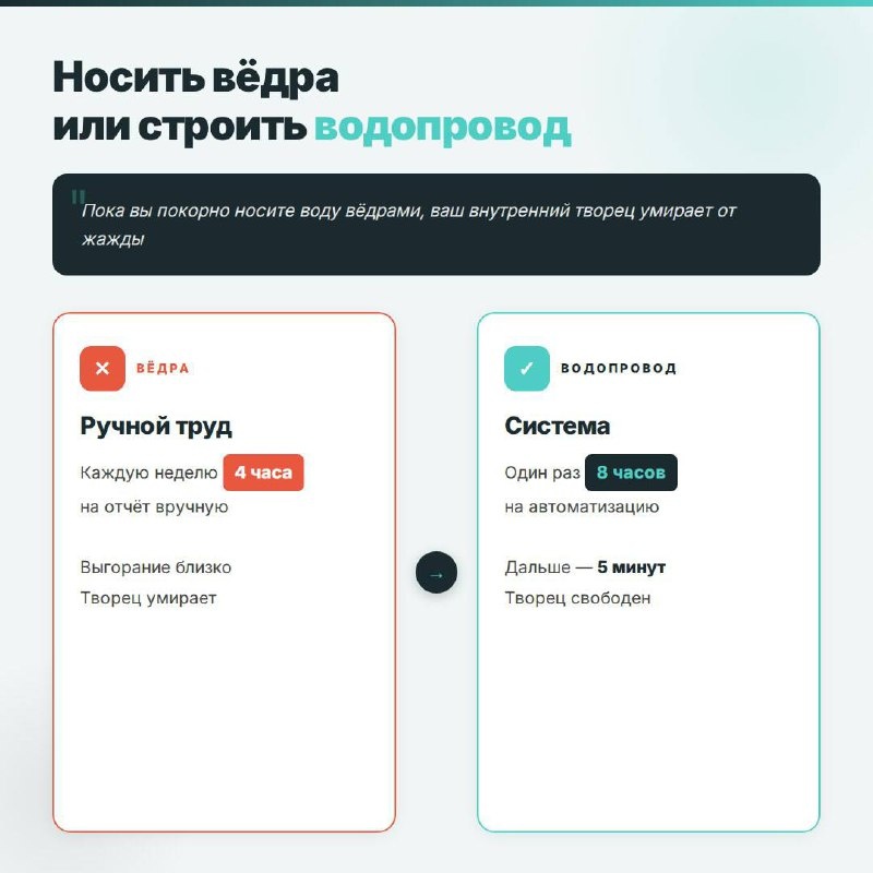 ? В моём окружении подозрительно часто мелькало это имя — многие знакомые были у него на обучении и отзывались очень хорошо. Когда у меня появилась возможность попасть к нему на мероприятие, я конечно с большим любопытством откликнулась. Мероприятие было про психологическую устойчивость лидера — разбирали 14 инструментов профессионального роста. Сам Сафин называет это «интеллектуальным развлечением». И это правда не было занудным вещанием свысока — было много лёгкости, юмора, живой реакции и работы с аудиторией. Хочу рассказать про три инструмента, которые ценностно мне очень близки. 🔧 Носить вёдра или строить водопровод пока вы покорно носите воду вёдрами, ваш внутренний творец умирает от жажды Когда я работала финансистом в найме — я носила «воду вёдрами» каждую неделю и каждый месяц. Мы сдавали отчётность для головного офиса, для локальной команды, что-то постоянно считали и собирали какие-то таблички. Мой внутренний творец мучительно умирал каждый месяц ) Тогда я стала изуч