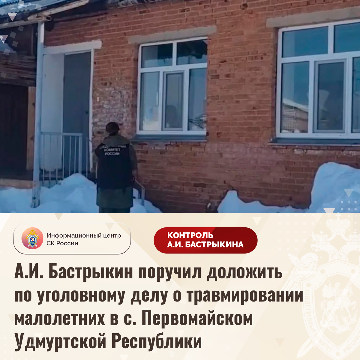 А.И. Бастрыкин поручил доложить по уголовному делу о травмировании малолетних в с. Первомайском Удмуртской Республики В сети Интернет сообщается, что в марте текущего года в селе Первомайском Удмуртской Республики в результате схода снежных масс с крыши здания школьной столовой пострадали двое малолетних. Детям потребовалась медицинская помощь. В СУ СК России по Удмуртской Республике возбуждено уголовное. Председатель Следственного комитета Российской Федерации Александр Иванович Бастрыкин поручил руководителю СУ СК России по Удмуртской Республике Рустаму Рашидовичу Тугушеву доложить о ходе и результатах расследования уголовного дела. Исполнение поручения поставлено на контроль в центральном аппарате ведомства. #СледственныйКомитет #СКРоссии #СКР #ИЦСКР #Информационныйцентр #АлександрБастрыкин #ПредседательСКР #КонтрольПредседателяСКР #КомментарийКонтроль #Удмуртия