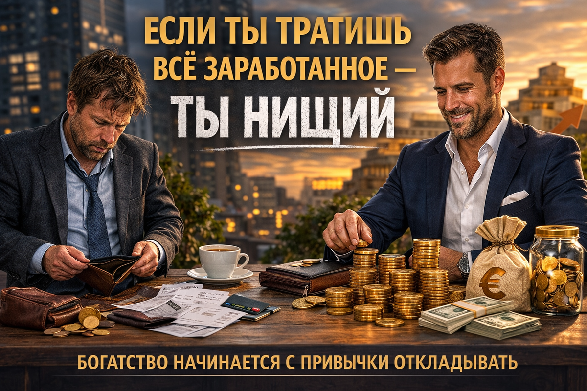 В книге «Самый богатый человек в Вавилоне» есть одна мысль, которая сначала звучит почти жестко. Что такое богатство на самом деле. Если человек зарабатывает 10 монет и откладывает 1, он богаче того, кто зарабатывает 100 монет, но тратит их полностью. Сначала эта идея кажется странной. Мы привыкли измерять достаток размером зарплаты, должностью, уровнем жизни. Но если посмотреть честно, богатство начинается не с дохода. Оно начинается с привычки оставлять часть денег себе. Представьте двух людей. Один зарабатывает 100000 рублей в месяц и тратит их до последней копейки. К концу месяца у него снова 0. Второй зарабатывает те же деньги, но откладывает хотя бы 10%. Всего 10000 рублей. Сумма кажется небольшой. Но через год у него уже будет 120000 рублей накоплений. Это не фантастические цифры, не инвестиционные схемы и не сложные стратегии. Это просто привычка сначала заплатить себе, а потом уже всем остальным. Интересно то, что большинство людей спорят с этой идеей. Говорят, что инфляция вс