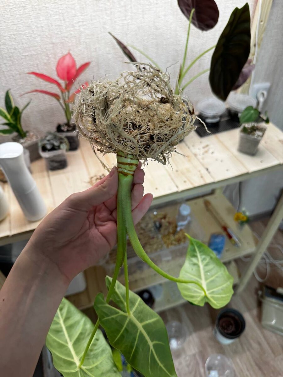 Это случай, когда подарок оказался ещё интереснее после пересадки. Я решила аккуратно достать растение из горшка, чтобы посмотреть на корни. В итоге это превратилось в небольшую археологическую раскопку. 💚корневая оказалась очень мощной 💚корни плотные, длинные, переплетённые между собой 💚старый грунт буквально пришлось вымывать и распутывать руками Я обожаю смотреть что в корнях у алоказии, для меня это как киндер сюрприз) В этот раз достала 4 мощных клубня, уже с корнями. Грунт я вымывала из корней в тазике, очень плотные корни и земля там прям стояла комом, который невозможно разобрать. Просушила час корни, не поливаю второй день, чтобы её не залить. Посадила в смесь грунта и лечузы 50/50. Буду экспериментировать, до этого опыта с лечузой у меня не было. Скоро мне приедет мини-тепличка, как раз для клубней. Скоро напишу пост и про алоказию после пересадки и про клубни🌸