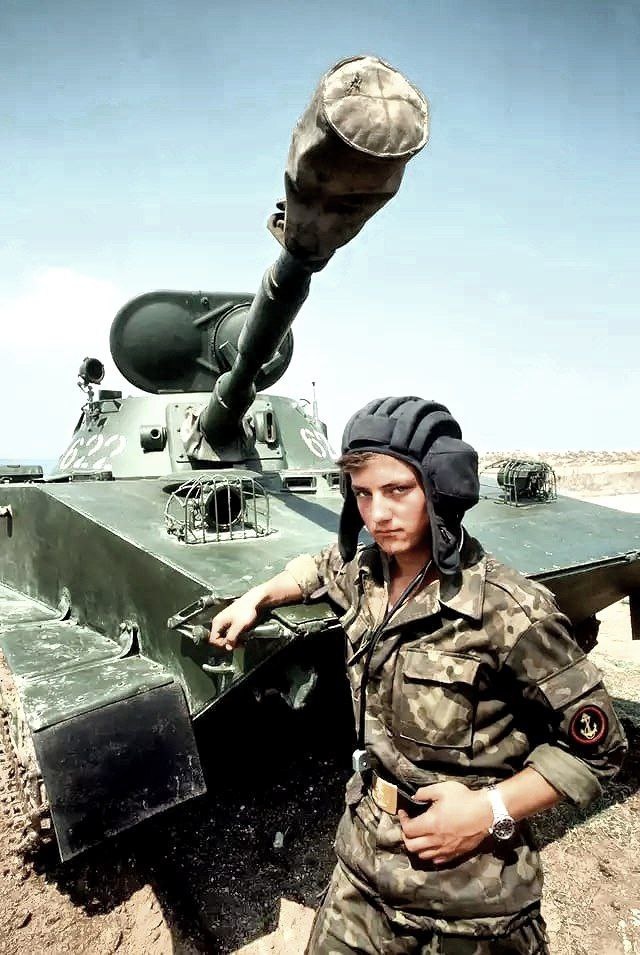 Советский морской пехотинец, стоящий у лёгкого плавающего танка ПТ-76, продемонстрированный американцам